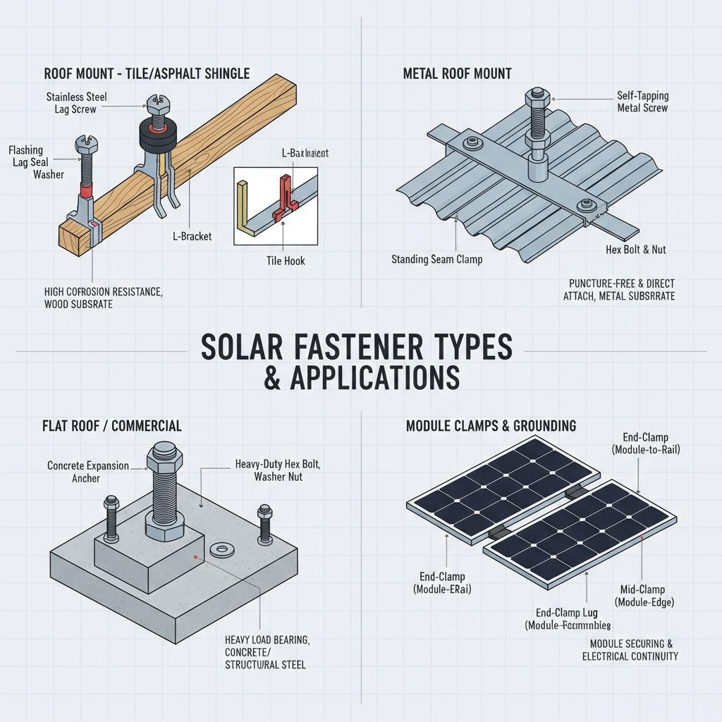 Various types of fasteners for solar panel installation cater to different mounting scenarios. Stainless steel lag screws are commonly used for roof penetrations, providing a strong hold into wooden rafters without compromising waterproofing. For metal roofs, self-tapping metal screws with integrated seals offer quick and secure attachment, reducing installation time. Aluminum or galvanized clamps secure panels to rails without drilling, ideal for non-penetrative mounts that preserve roof warranties. Bolts and nuts, often paired with lock washers, are vital for ground-mounted arrays where heavy loads from snow or wind require robust connections. Choosing corrosion-resistant materials like 316-grade stainless steel is key in coastal or humid areas to prevent rust and ensure decades of performance. Each type must comply with standards such as those from the Solar Energy Industries Association (SEIA) to guarantee safety and durability.